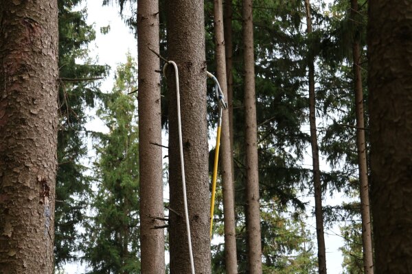 Anschließend ging es an die seilunterstützte Baumfällung. Als einfache und sichere Methode für die seilunterstützte Holzernte demonstrierte Michael Wenni die „Königsbronner Anschlagtechnik“ an einer Fichte. Mithilfe einer Teleskopstange wird dabei ein Seil zur sicheren Fällung in entsprechender Höhe angebracht. Michael Wenni empfiehlt mindestens 5 Meter. Im Verlauf der Fällung gingen die Fachleute auf weitere sicherheitsrelevante Aspekte ein, wie die persönliche Schutzausrüstung, Bruchlast von Kette und Seil oder den sicheren Arbeitsplatz.